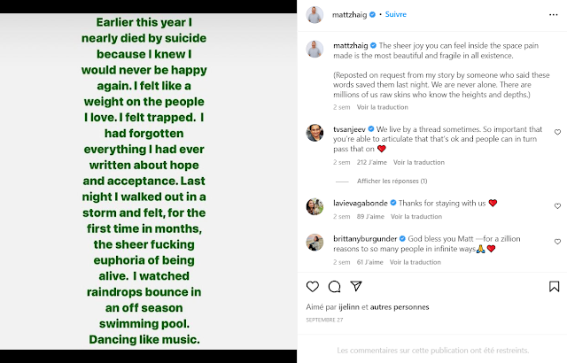 La Bibliothèque de minuit est un livre inspirant qui fait réfléchir, un voyage réconfortant dans une histoire où tout est possible ! Le 27 septembre dernier, l’auteur Matt Haig a posté un message qui interpelle sur son compte Instagram (voir screen ci-dessous). Il explique en effet qu’il a déjà pensé au suicide mais qu’une fois retrouvé le goût de vivre, des choses simples comme sortir sentir l’odeur de la pluie l’a fait se sentir pleinement vivant. Il y a donc de l’espoir.