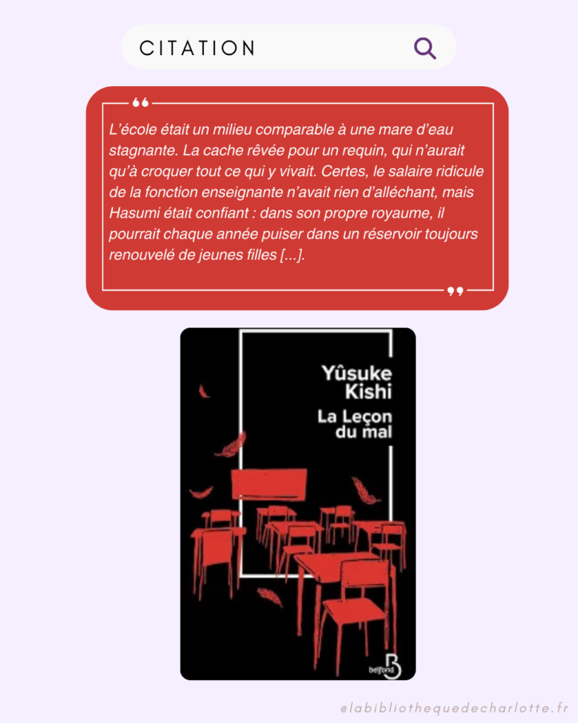 Dans La Leçon du mal, on est au Japon, dans le lycée Shinkô Gakuin de Machida (à Tokyo). On suit Seiji Hasumi, un professeur d’anglais charmant, adulé par ses élèves. On remarque vite qu’il a une grande maîtrise de la psychologie et arrive facilement à analyser ses élèves ou ses collègues. Sans vraiment savoir pourquoi, j’ai trouvé ce personnage principal repoussant. Je le trouvais bizarre, étrangement dérangeant jusqu’à me rendre compte qu’il s’agissait d’un manipulateur de haut vol. C’est tellement perturbant de haïr le héros d’un livre. Ici, je peux vous assurer que vous allez finir par détester Hasumi car derrière ce professeur exemplaire se cache un véritable psychopathe. Ensuite, la seconde partie du livre va basculer dans la folie et la violence les plus totales. La tension montera jusqu’à en devenir complètement suffocante.